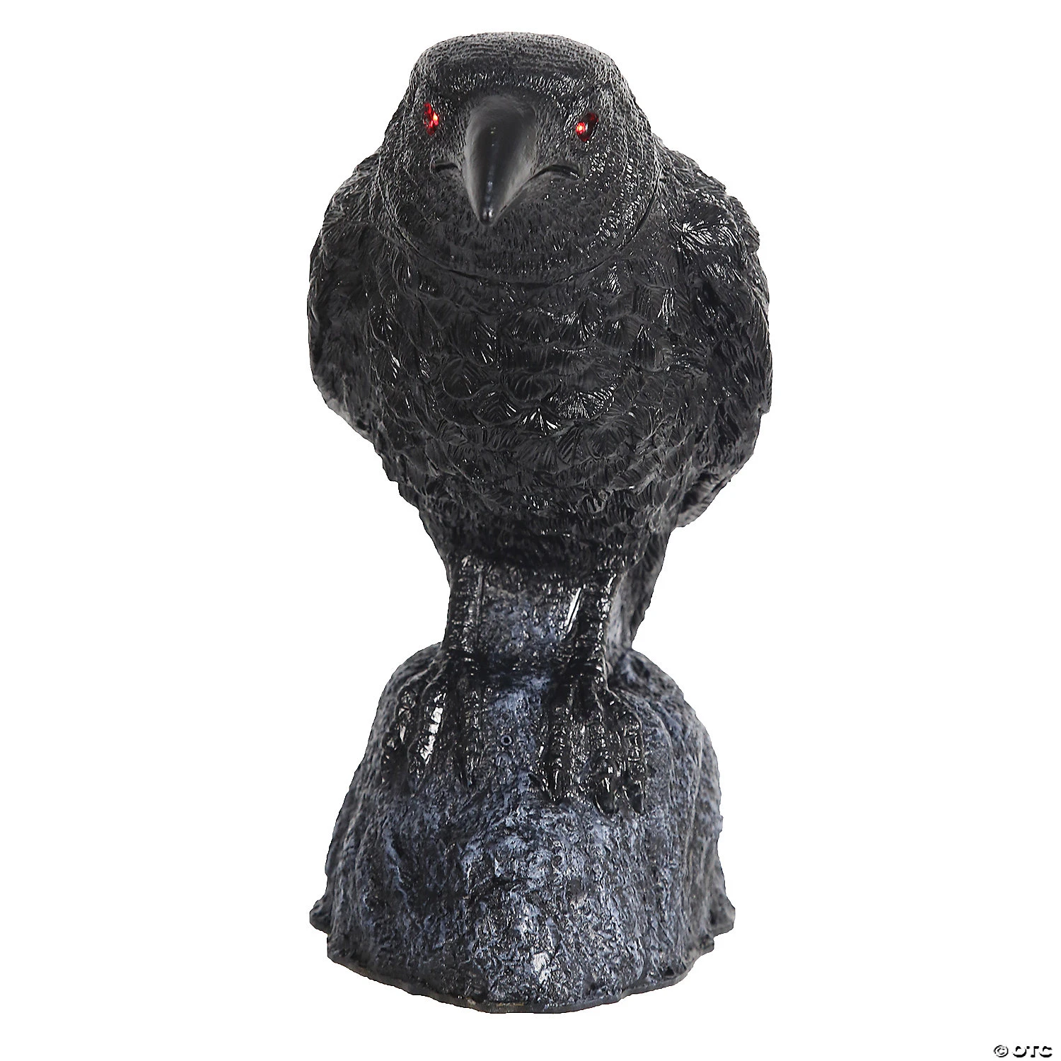Raven with Turning Head and Sound Great addition to your haunted scene! Animated Crow with lightup eyes caws as his head turns from side to side. Haunted moaning wind sounds are in the background. Requires 3 AA Batteries (Not Included) Material: Plastic. Raven measures approximately 13″ tall. Box measurements are 17 x 16 x 8.
