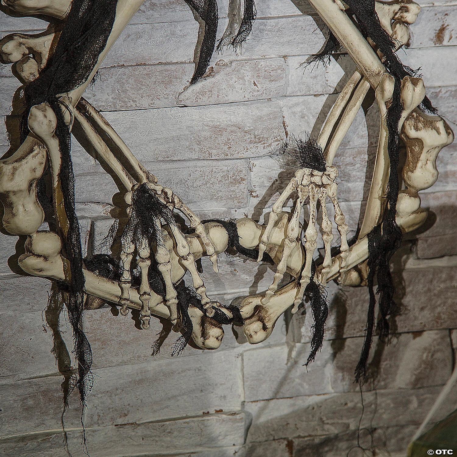 Light-Up Bone Wreath Your victims will know you ft.re in the spirit of the season when they see this all-bone wreath on your door at your Halloween party. Light-up skull eyes give a very creepy staring look. Chilling! This measures approximately 14.6″x 16.5″x 2.8in. Uses 2 AA batteries, not included.
