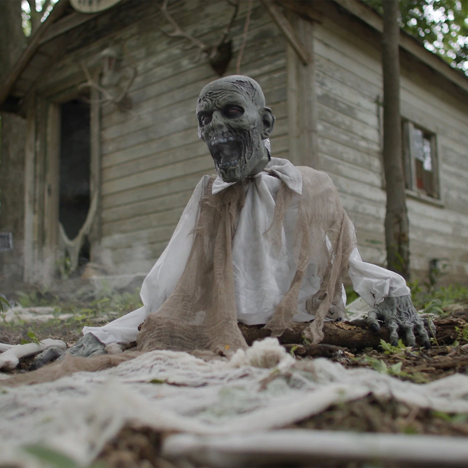 Bring your Halloween decorating ideas to life with the perfect Halloween prop for your haunted house! Easy to set up, this Gaseous Zombie Animated Fog Prop will provide your Halloween home décor with the frights you crave. Standing 2ft tall, the Gaseous Zombie looks like he is pulling himself out of the ground – and then sprays the whole area with fog! Hard plastic frame is under his poly-fabric shirt and shroud with an attached 110 volt motor that turns his hand-painted plastic head with gaping mouth from side-to-side, and also comes with two creepy hand-painted plastic hands to complete the look. The 3ft long connector and hose attachment will fit on most standard 400w, 700w, and 1000w fog machines. (Fog machines only sold separately. Connector is not compatible with Ground or Low Lying Fog Machines). Just stuff the sleeves of the shirt yourself with crumpled newspaper, hook up the hose to your fog machine and let the creepiness begin!