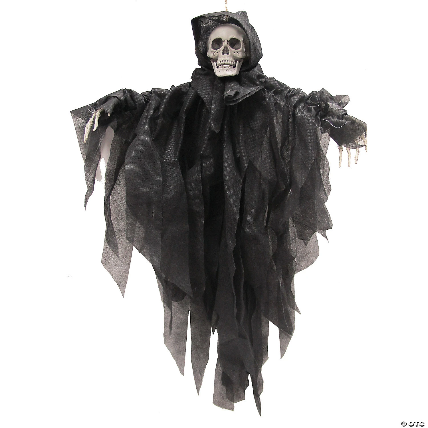 Black ReaperEvery haunt should have a reaper, and this one would be perfect. Very ominous and scary! This reaper, shrouded in black with only his skull and hands visible, is sure to create a lot of commotion at your haunt or Halloween display. This measures approximately 29.5″x 23.6″x 3.1″.
