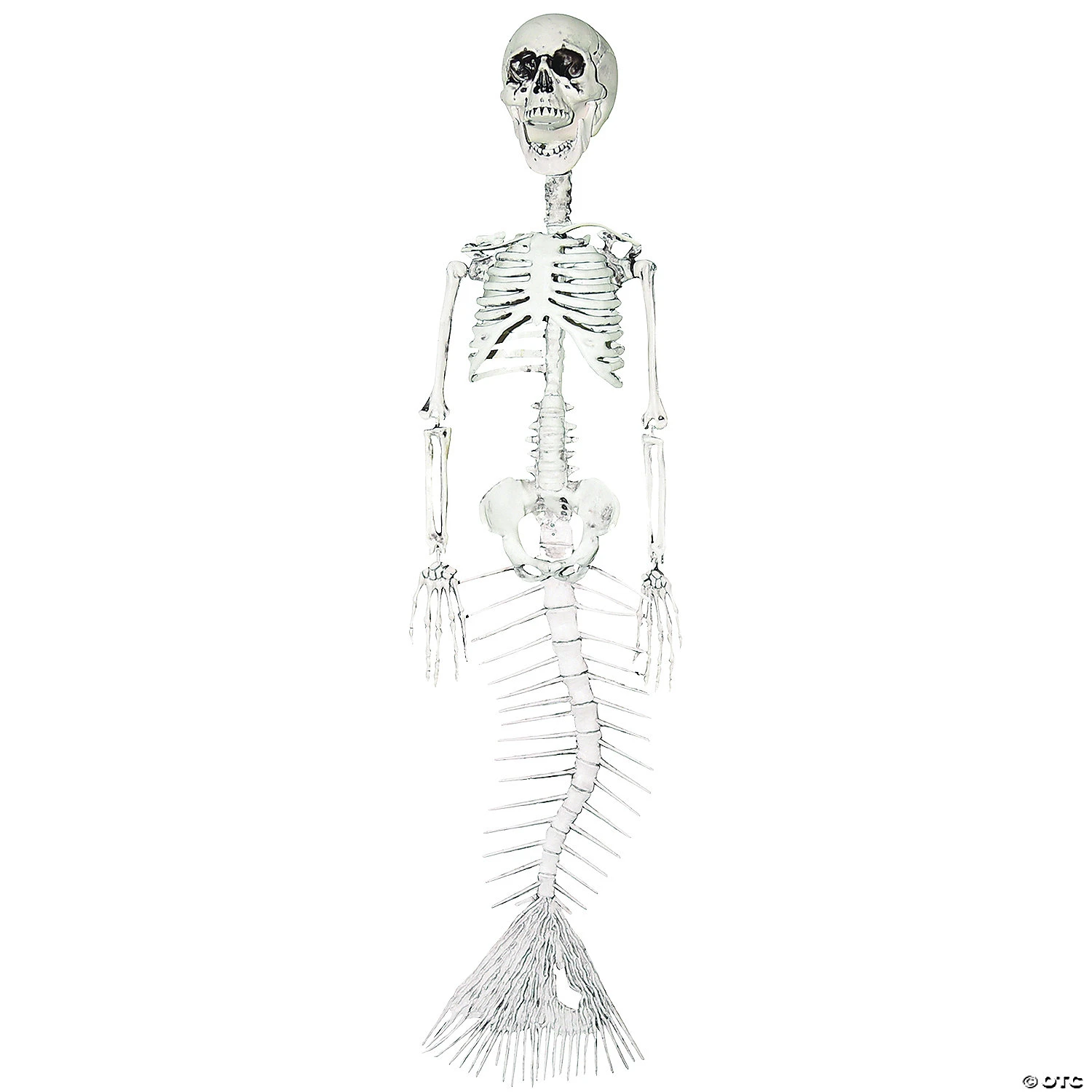 30″ Mermaid Skeleton DecorationEveryone will want this unique Mermaid Skeleton! Plastic skeleton figure is clearly human upper body with a fish skeleton and tail fin where the legs should be. Measures approximately 29.5″ long, 12″ wide.