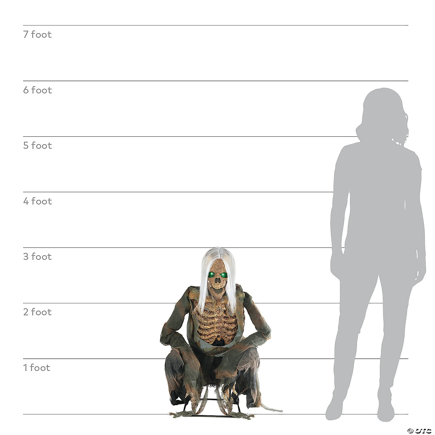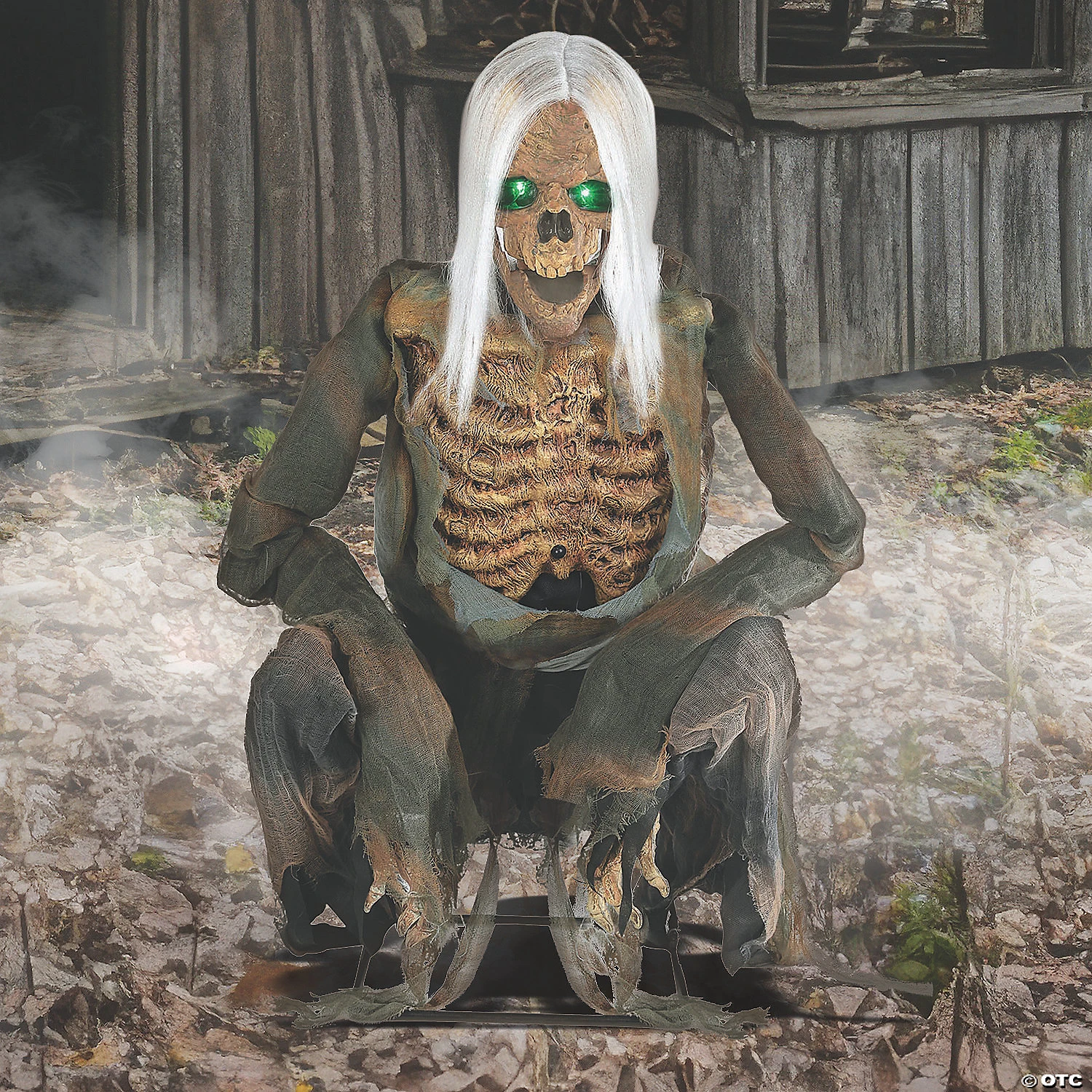 Crouching Bones is watching you as he guards the haunted cemetery! His skeletal body moves side-to-side trying to keep trespassers as far away as possible. Features long white hair green LED eyes dangling jaw and hands. Optional idea: add your own mini fan in front of Crouching Bones to make him more creepy. (Fan not included). Made of: polyurethane metal polyester, PVC, and electronic parts. Life-sized prop measures approximately 36 inches tall.
