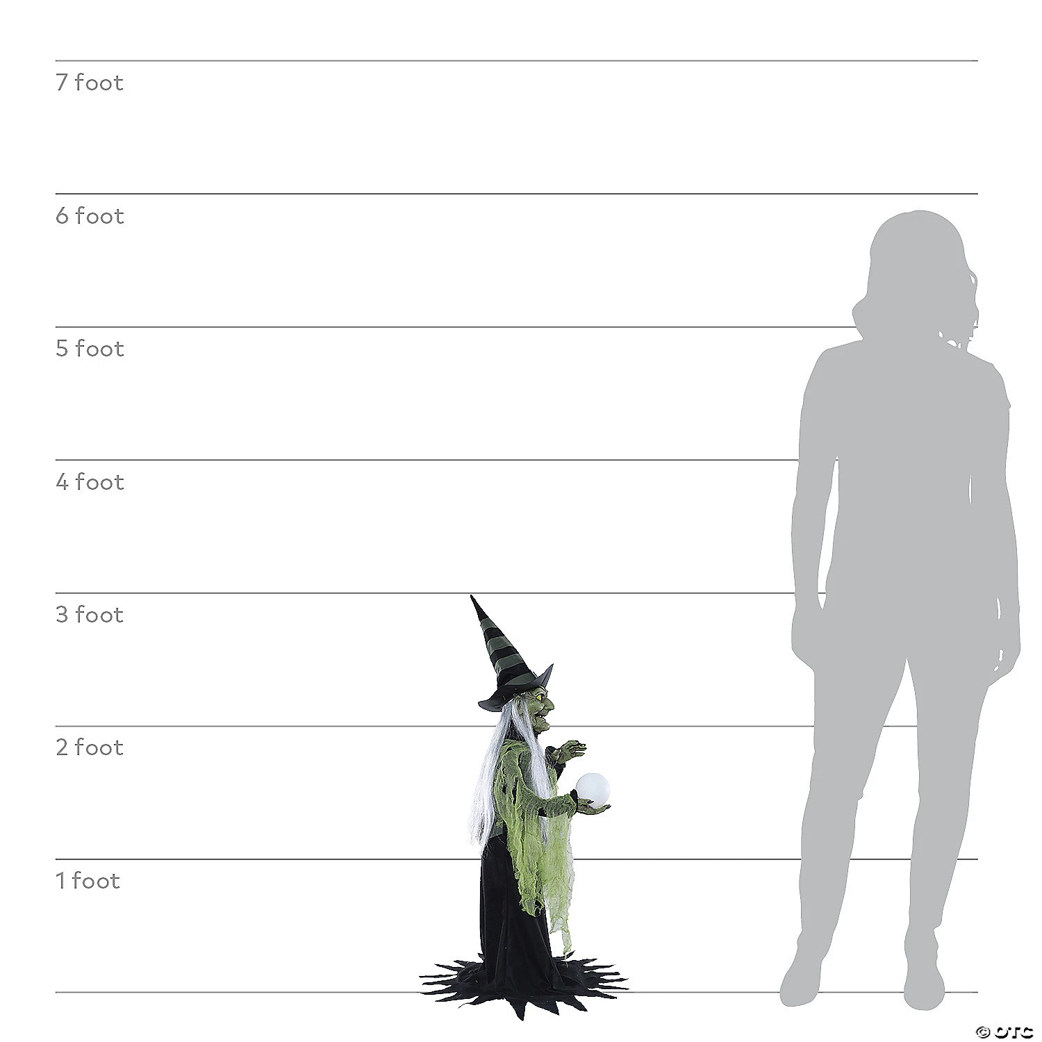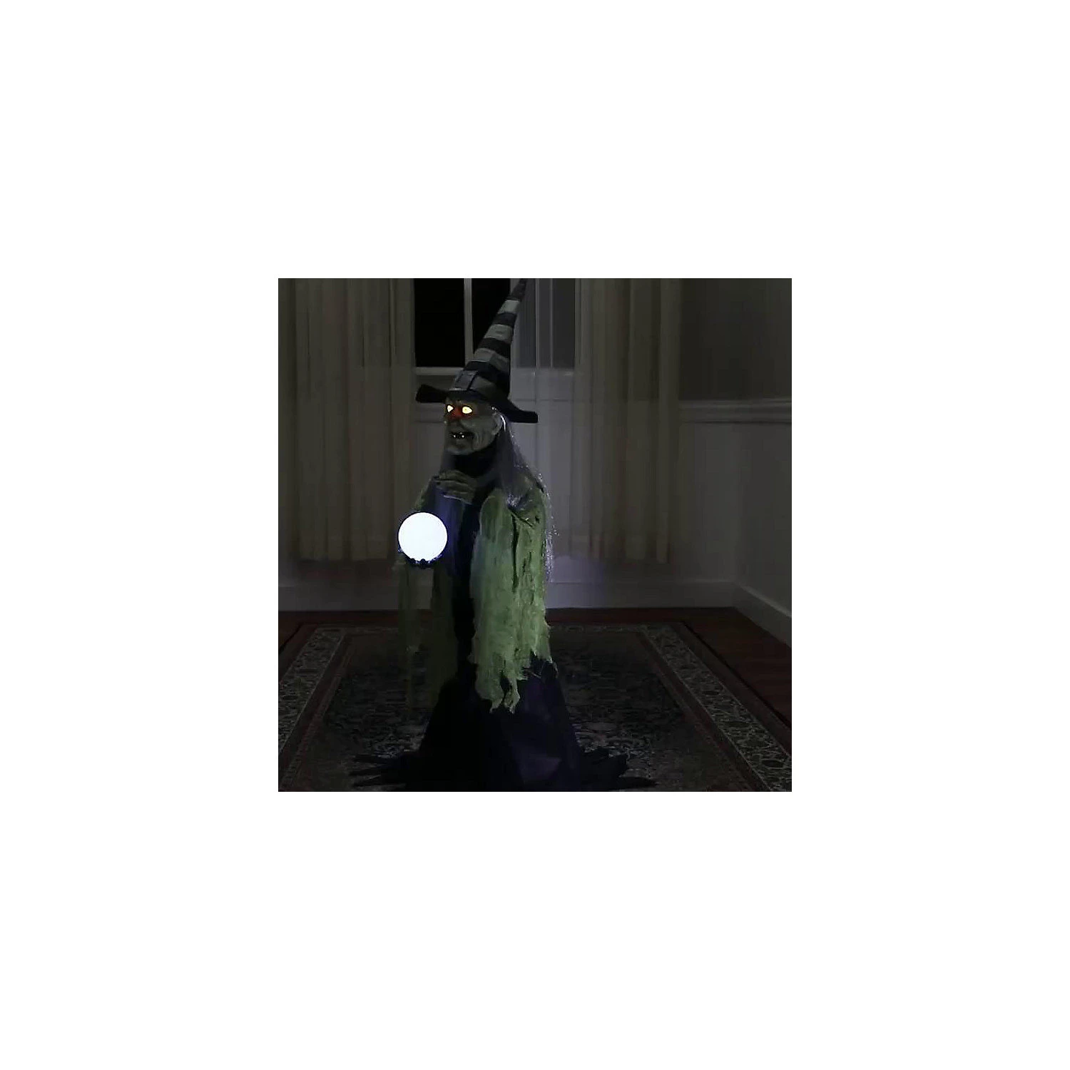 Step right up, step right up! Come see the 36-Inch Animated Fortune Teller Witch! This spooky animatronic will have you entranced with her bewitching movements and ethereal light show. Watch her eyes light up yellow as she speaks her spells and cackles an eerie laugh! Enjoy the changing colors of her orb as Her Head and Hands move side to side. Her smaller height means you can tuck her into your haunted scene easily for a great effect. Don’t miss out on this enchanting experience!