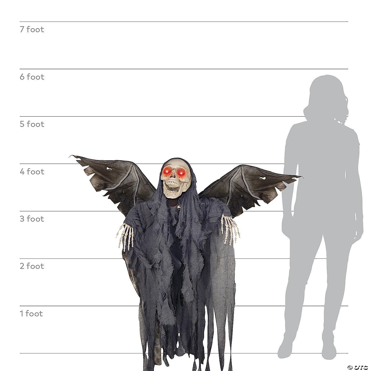 4.2 feet tall reaper prop with flapping wings and lightup eyes. Requires 3 AA batteries not included. Sound activated. 50 x 42 x 12 inches