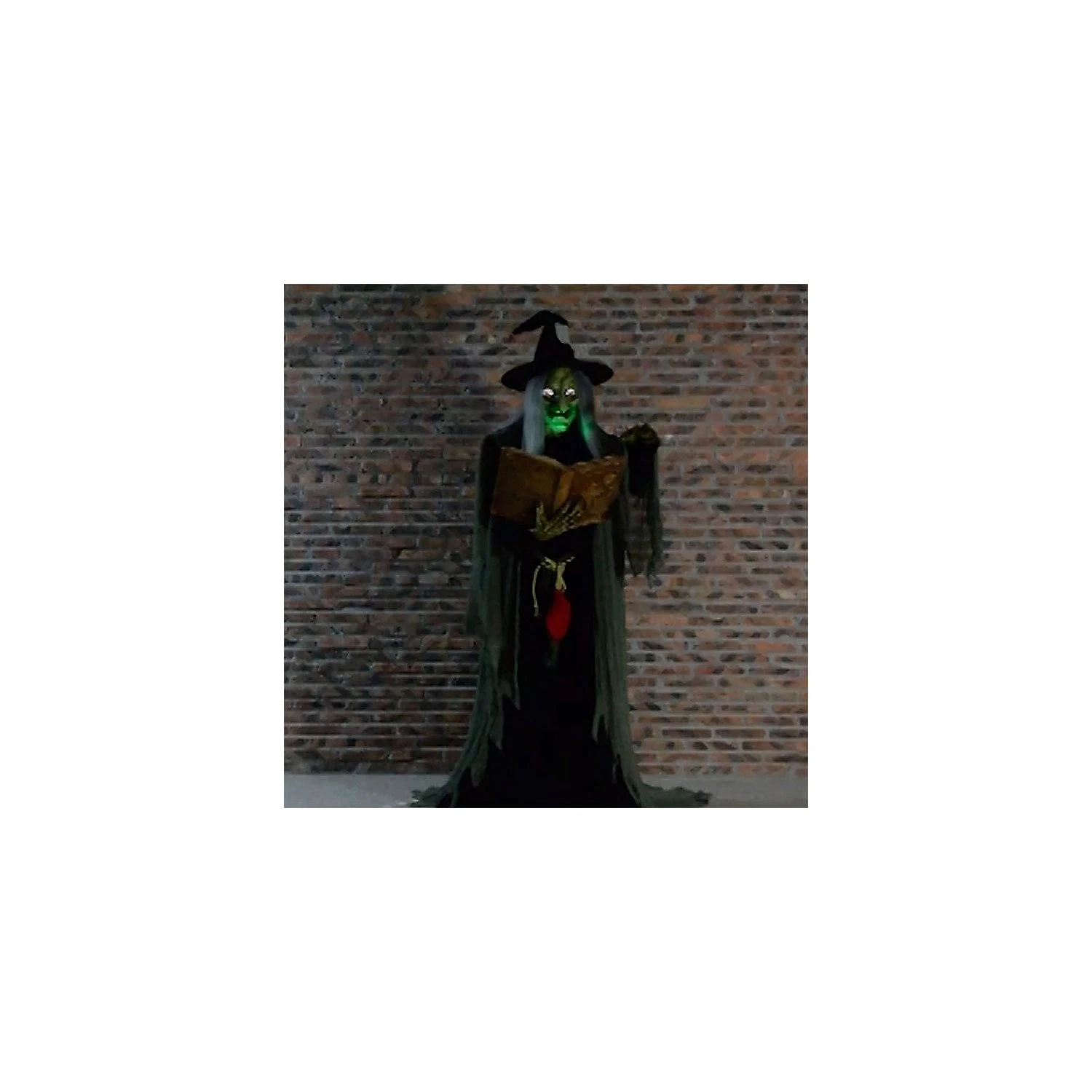 This creepy witch is a fun Halloween animatronics prop that will cast a spell on your Halloween party guests! Great for haunted houses, this Spell Speaking Witch stands approximately 5 ft 8″ tall to the top of her hat, and features a latex head with light-up eyes & moving mouth, an easy-to-assemble metal frame, plush-PVC hands & book with green LED lights that illuminate her face as she casts spells. Assembly required. Special Shipping Information: This item ships separately from other items in your order.