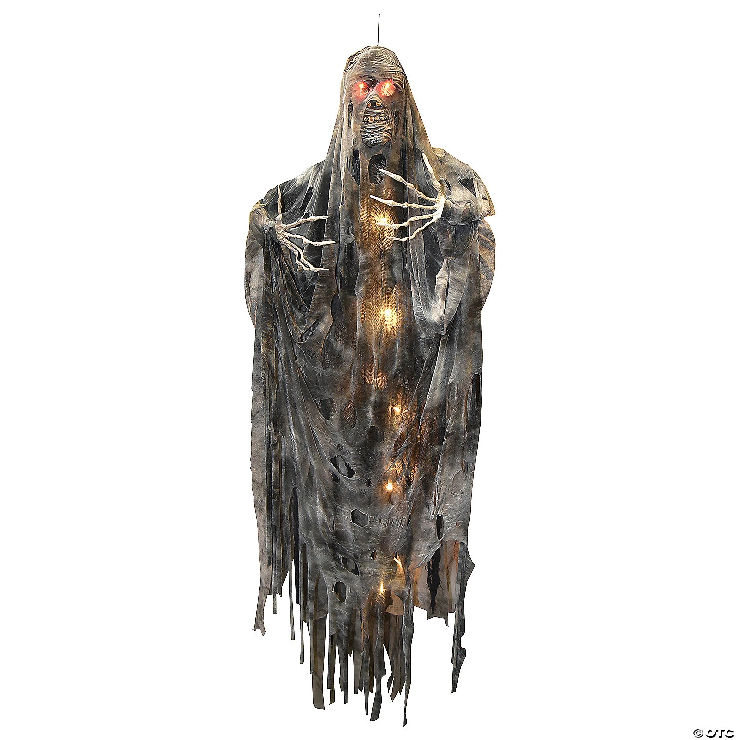 Create an eerie mood when you add our 6-foot Light-up Mummy to your Halloween décor! His plastic mummy head and torso are covered in a rotting aged shroud, and his posable arms end in long spindly fingers, reaching out to get you! Light-up eyes in his skeletal face glow with red light, and a series of lights runs all the way down the torso. Spooky sounds play in the background. Sound activation. Requires 3 AA batteries, not included. Measures 72 inches tall x 45 inches wide x 7 inches deep.