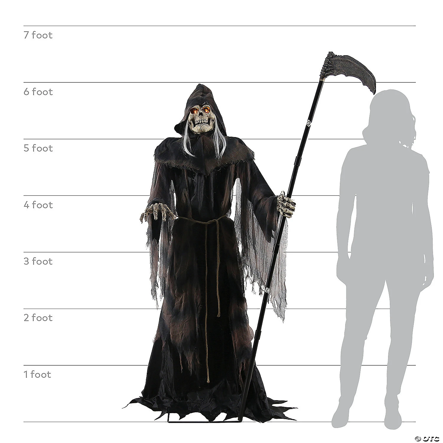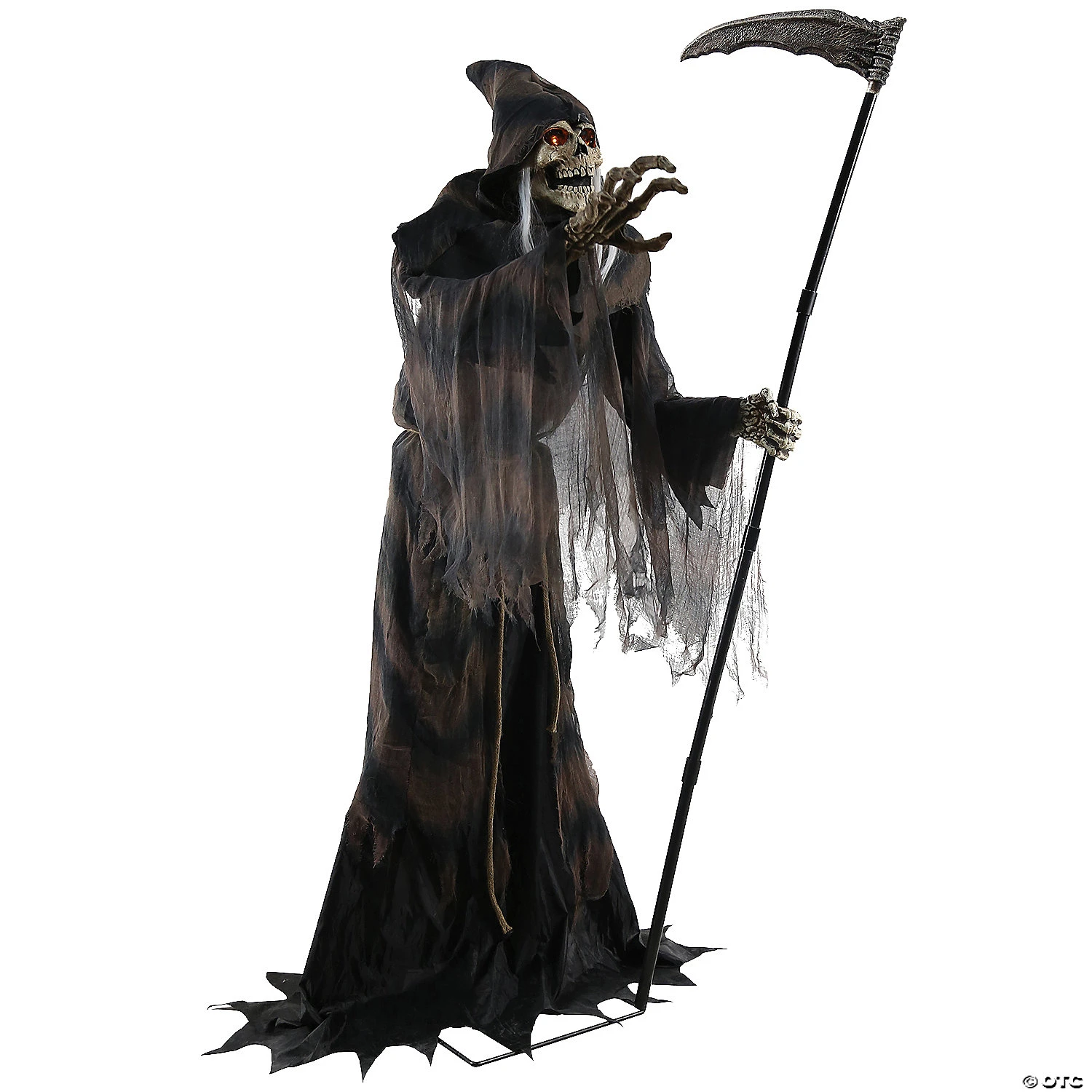 Do you not fear The Reaper? This terrifying 6 ft. character with slush-PVC skeletal hands plastic reaper’s Scythe is dressed in a black and gray fabric hooded costume with shredded-gauze detailsfeatures a soft-PVC death’s head skull with yellow LED light-up eyes. Additional features include: Easy-to-assemble metal frame. Easy-to-assemble quick-connect poles. Assembly required. Includes volume control. Plug in the UL power adapter into any standard outlet choose from Steady-On, Infra-Red Sensor or Step-Here Pad (included) activation options to operate. Once activated, the Lunging Reaper’s eyes will light up with an other-worldly glow as he lunges towards you while saying one of four sayings. The infra-red sensor works up to 6.5 ft. feet away works in all lighting conditions – bright light to no light!.Special Shipping Information: This item ships separately from other items in your order. This item cannot ship to a P.O. Box. This item may be subject to additional processing days.ITEM IS NOT ELIGIBLE FOR EXPEDITED SHIPPING