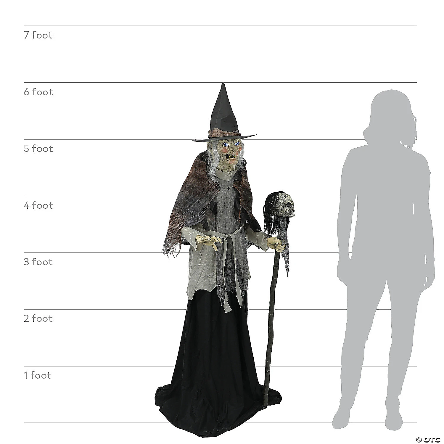 The Glowing Eyes of the 72-inch Lunging Digiteye Witch Animated Prop are brought to life digitally with patented Digiteye technology! She lunges at unsuspecting people as they pass by, reaching out with a gnarly hand as if to drag them into her cold embrace. Her other hand hold a creepy skull-topped staff! Her face is made of artfully sculped latex with a Moving Mouth that adds a life-like look to an already incredibly realistic Animatronic Prop. With a crackling Voice she Speaks one of Four spine-tingling Phrases:Phrase #1: “Well hellooo! You don’t happen to have some candy for a sweet little old lady do you? Give it to me!! You’re too fast for me, but I’ll get it next time, ah haha haha ha.”Phrase#2: “Do you not fear ugly witches? Perhaps you should, since one poisonous touch from me will wither your soul- Gotcha! ah hahahaha! Ah, you escaped my grasp, for now!”Phrase #3: “Want to play a game of tag? If I catch you, I get to turn you into a Toad! Abra Cadabra! Ooh, drat! Judging by the speed you jumped back, perhaps you are part Toad already! He he he!”Phrase #4: “Excuse me, can you help a sweet old lady find her cauldron? I can’t seem to find it anywhere. I GOT YA!! Ooh, he he he! Oh, if you weren’t so fast, you’d be in my cauldron right now!”Phrase #5: “(assorted laughs and cackles)”Three activation options include, Steady-On, Infra-red Sensor, or Step-Here Pad. There is also a Volume Control so you can adjust to your surroundings. The Included Universal Adapter has 4 changeable plugs and works in USA, UK, Germany and Australia.