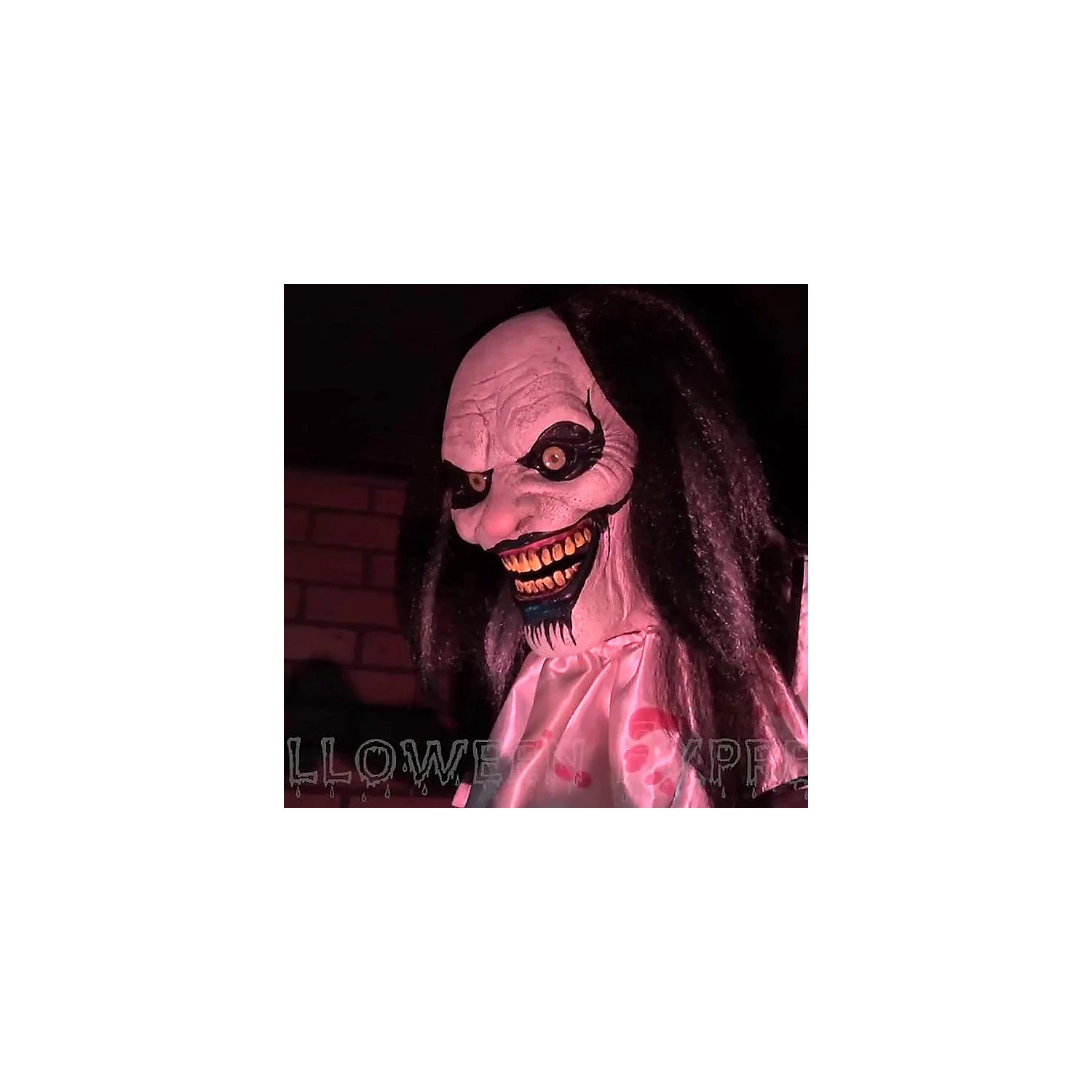 This intimidating 7-foot tall animated towering creep features an easy-to-assemble metal frame long black hair black & white striped costume and large black clown shoes. He has two creepy elongated hands one of which is holding a small child by the feet! The Sweet Dreams Clown’s eyes will glow with green glee and his head and torso turns side-to-side while he says one of 3 terrifying sayings ( inchesmaniacal laughter inches inchesOh look what I have screams), a new volunteer for my juggling act! (child screams) Looks like I have a live one (child screams) – but not for long hehehe! (child screams) inches, inchesWakey wa and shine sleepy head! (child screams) This should teach you to always look under your bed! (child screams) And in your closet hahah! (child screams) inches) as the screaming child holding by the feet screams and flails about! Plug the UL power adapter into any standard outlet and choose from Steady-On, Infra-Red Sensor or Step Here Pad (included) activation options to operate. The infra-red sensor works up to 6.5 feet away and works in all lighting conditions – bright light to no light! Item includes volume control. Easy-to-assemble with quick-connect poles. Assembly is required. Materials: 40% Iron, 8% PVC, 2% Electronic, 30% Polyester, 20% Cotton. For indoor or covered-porch use only. This clown might be available for your next birthday party – whether you want him or not!Special Shipping Information: This item ships separately from other items in your order. This item cannot ship to a P.O. Box. This item may be subject to additional processing days.