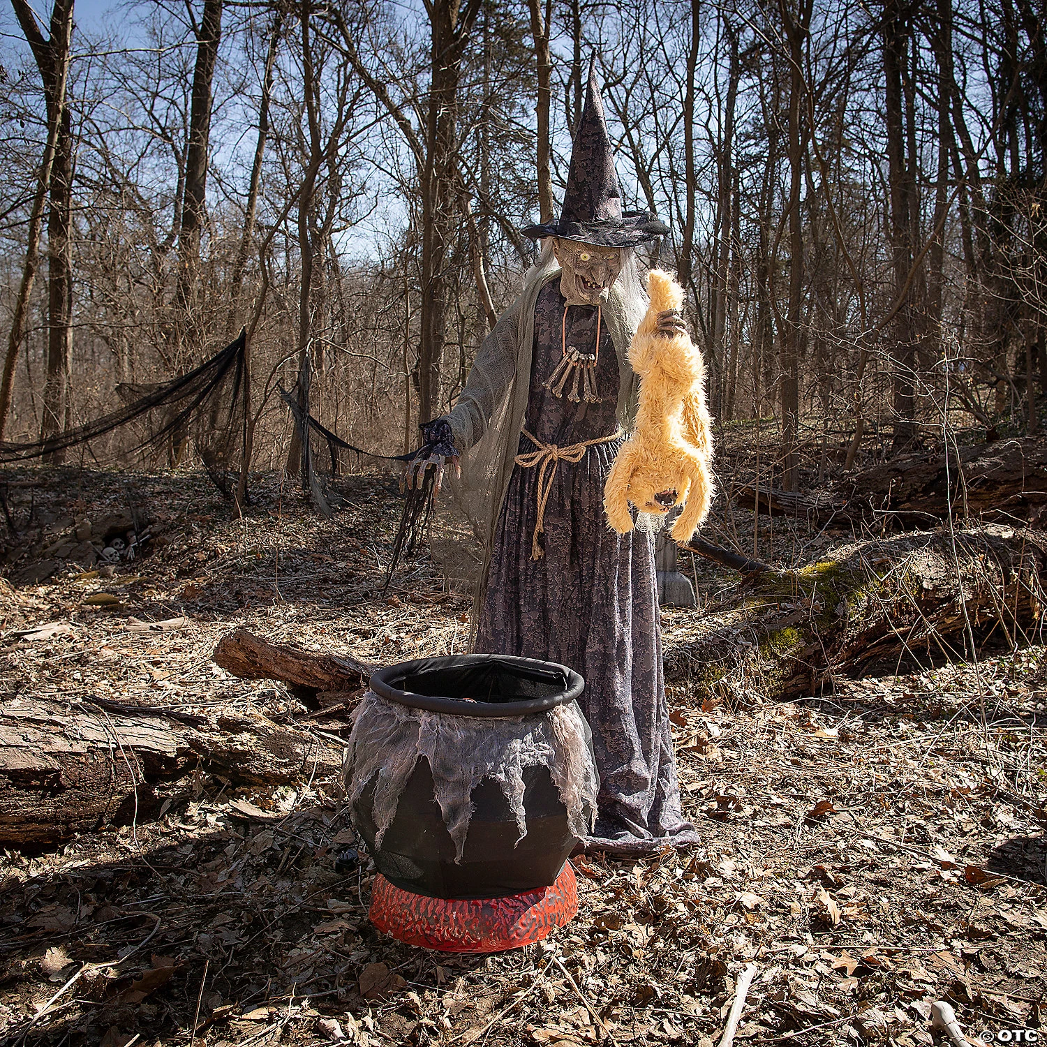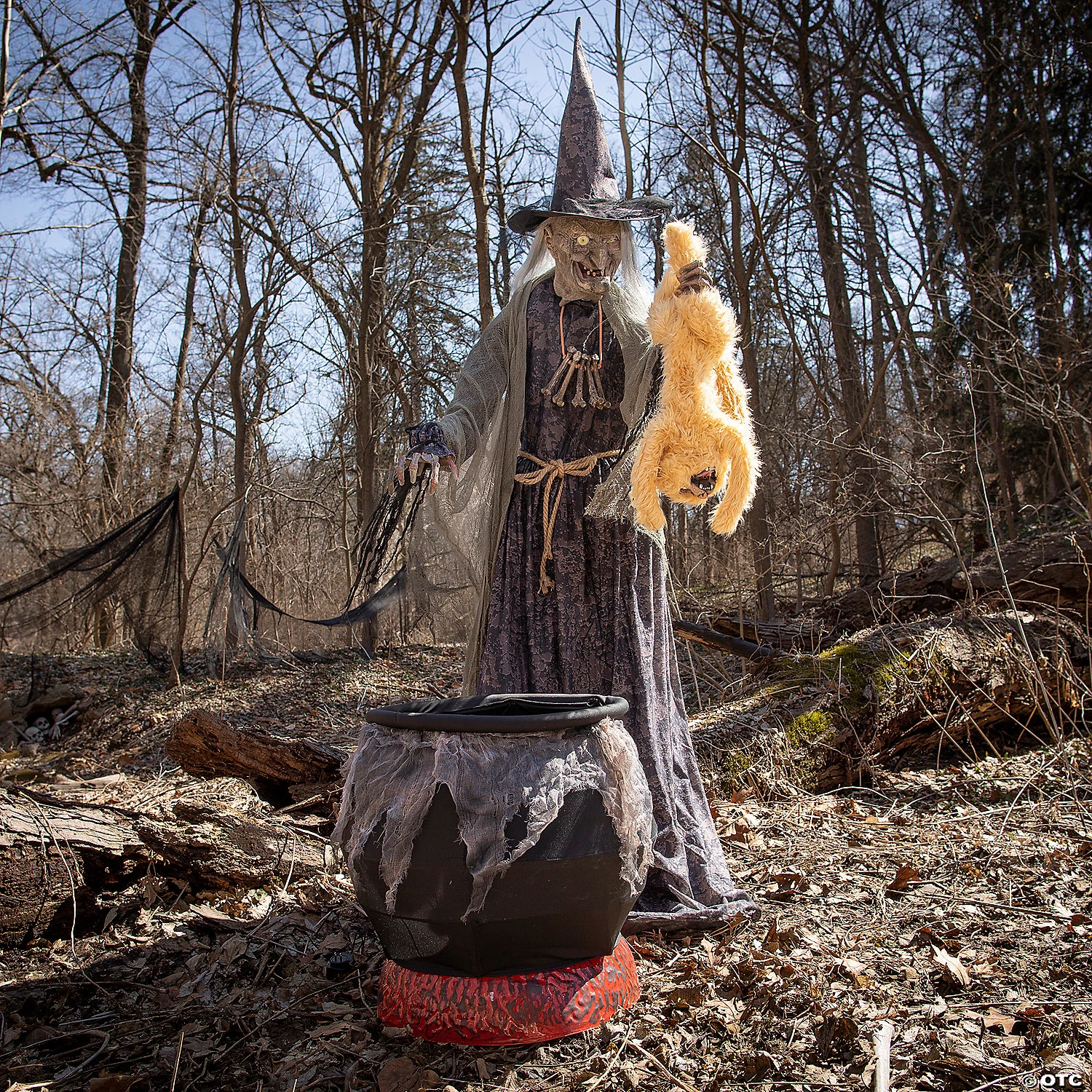 Scary withered witch animated prop decoration will be perfect for your next haunted house or home Halloween decor! Our Cauldron Cat-Tastrophe Animated Prop depicts a sinister sorceress standing before her bubbling black cauldron with flickering “smoldering coals” while holding a mangy cat by the feet. The witch wears a mottled-brown and black dress with rope belt, a shredded-gauze shawl, a creepy bone necklace and a matching pointed hat. Easy to assemble with quick-connect poles and includes volume control. Animation: Eyes light up, head and torso turn from side-to-side, mouth moves, cat hisses and flails over the green bubbling cauldron. Made of iron, electronics, PVC plastic, polyester, and cotton. Includes UL Power Adapter. Prop will say one of three sayings with each activation: “(evil laughter)”: “Eh heh heh heh you will make a tasty meal – my favorite is the flesh from a black cat, but you will do nicely! Eh heheheheh!”: “See what happens when you cross my path? Let this be a lesson to you – and a meal for me! Eh heheheh!”. Activation options: Steady-on, infra-red sensor (works up to 6.5′ feet away and works in all lighting conditions), and step-here pad (included). Plug into any 110-wall outlet. Easy to disassemble and store for next year! 7 ft. Assembly required. Complete instructions included.