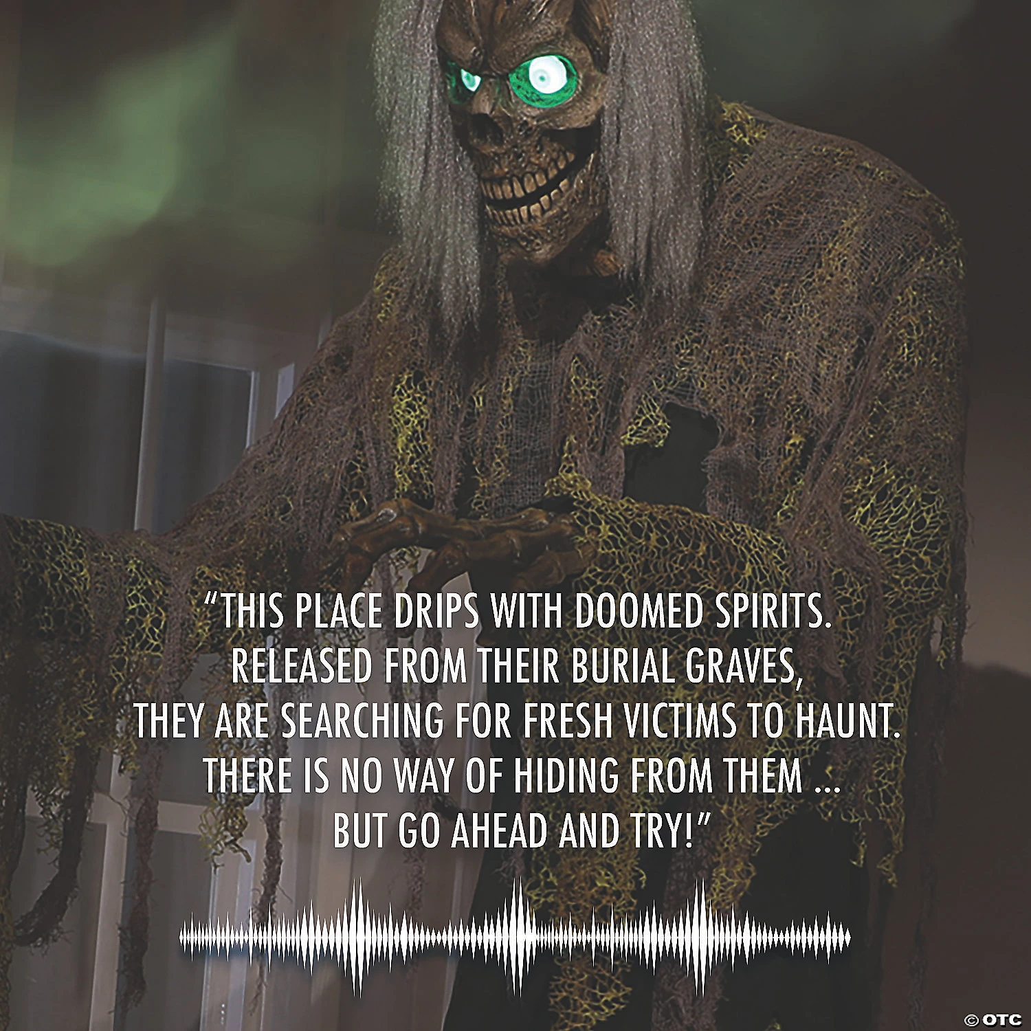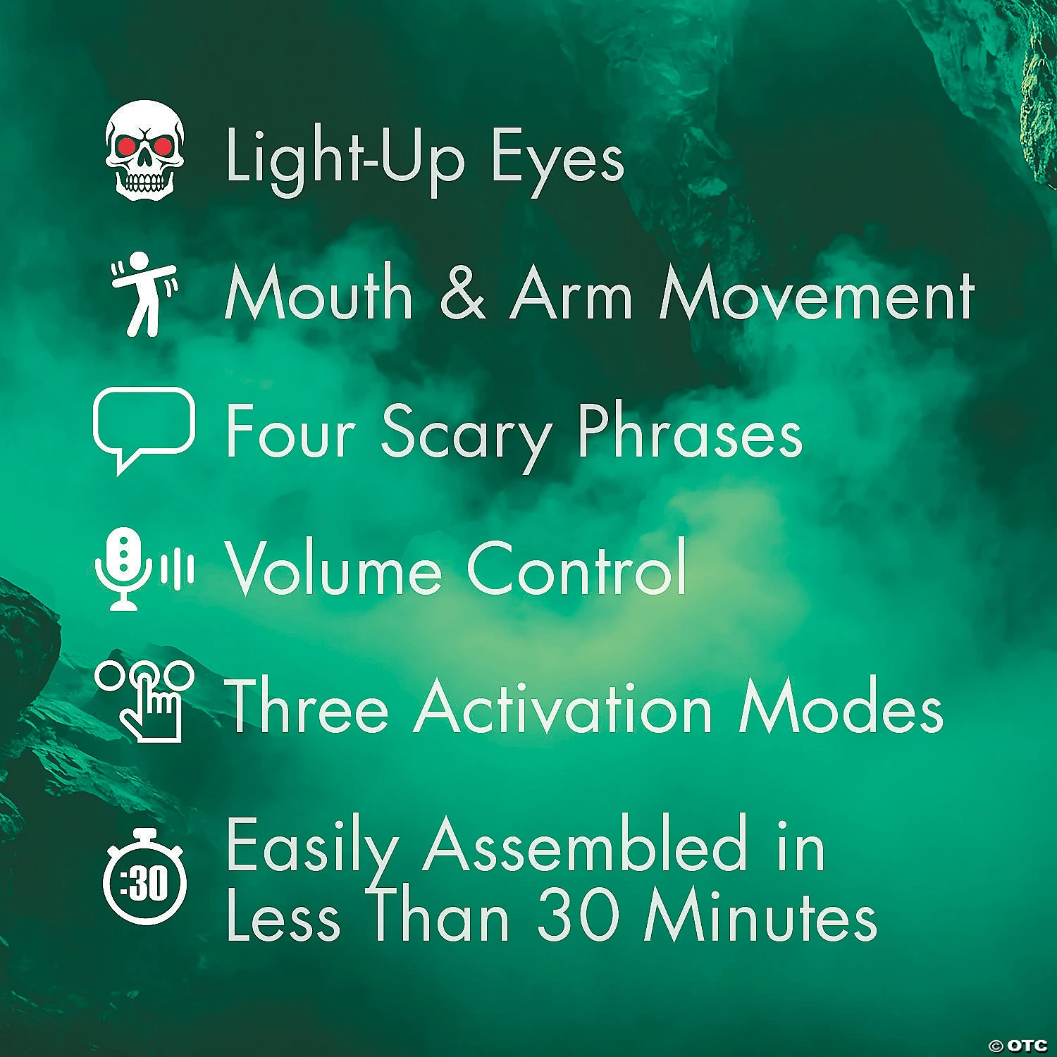 Lurking in the depths of your basement an undead terror awakens. The 7-foot Cellar Dweller Animated Prop covered in tattered rags has Glowing Green Eyes that pierce through the darkness, as his Head Turns and Mouth moves. His rough dry Voice speaks in a deathly tone as drips of water echo in the background. He speaks one of four scary phrases:Phrase #1: “This dank old house is oozing with foul stench of rotten souls. Its kept me thriving, as long as I hide down here with the rats. I’m happy to share with you, if you have the stomach for it! Huh huh huh!”Phrase #2: “Uuuuhhhh&hellip I ooze with the spirit of Halloween. Drip, drip drip it goes. Uuuuhhh&hellip”Phrase #3: “This place drips with doomed spirits. Released from their burial graves, they are searching for fresh victims to haunt. There is no way of hiding from them but go ahead and try! Huh huh”Phrase #4: “The syrupy, sick damp of the cellar has made me a moldy mess. But no matter. I’ve grown fond of the wet stench,and wantto share it with you! Uuuuhhhh!”His Arms also raise and lower, making his decrepit Boney Hands claw away at the darkness as an infrared sensor waits for the living to make a wrong move, activating his presence. Three activation options include, Steady-On, Infra-red Sensor, or Step-Here Pad. There is also a volume control so you can adjust to your surroundings. Constructed of durable metal rods that snap together, this piece is easily assembled in less than 30 minutes.The included Universal Adapter has 4 interchangeable plugs, and works in the USA, UK, Germany, and Australia.