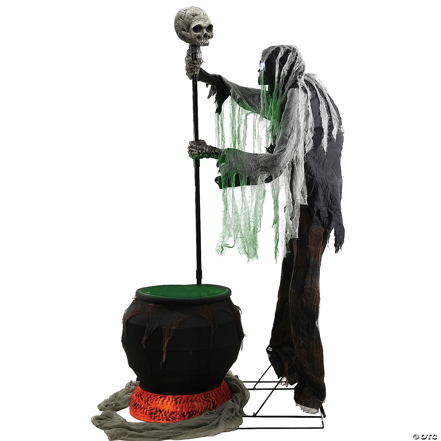 The 72 inch Cauldron Creeper Animated Prop loves stirring his stew – and wants to have you for dinner! He is wearing a tattered costume with long shredded-gauze accents.Featuring PVC head with hinged jaw, hands and chest with such realistic sculpted details you have to see to believe he’s not real – truly disgusting! Plug the UL power adapter into any standard outlet and choose from Steady-On or Infra-Red Sensor or Step Here Pad (included) activation options. Once activated this rotting corpse’s eyes will glow as his head raises and lowers while he slowly stirs the brew with his long staff topped with a rotting plastic skull in his glowing green cauldron withthe burning embers beneath it glow! He hasthree sayings (“(evil laughter) “, “The pot, I’ve put me flesh in, now I’ve naught. I’ll let it simmer ’til bubbling brew, and when it’s ready I’ll come find you! He heh heh”, “Ah, this is thickening,yessss. Heh heh, this cauldron is full of tasty morsels I have found. Would you like to give it a try? It’s Halloween, ANYTHING can happen this night! Heh Hah!”.Attach the optional Fog Hose (included) to your Fog Machine (not included) to add fog coming out of the cauldron to complete the spooky effect. The infra-red sensor works up to 6.5feet away andworks in all lighting conditions – bright light to no light! Includes volume control. Easy-to-assemble quick-connect poles. Assembly required. Materials: 40% Iron, 8% PVC, 2% Electronic, 30% Polyester, 20% Cotton