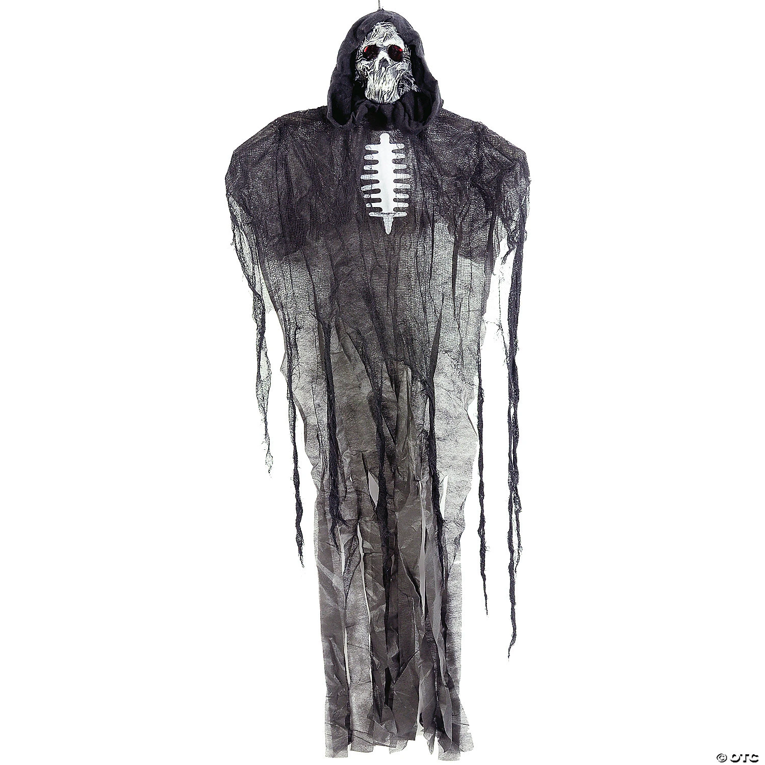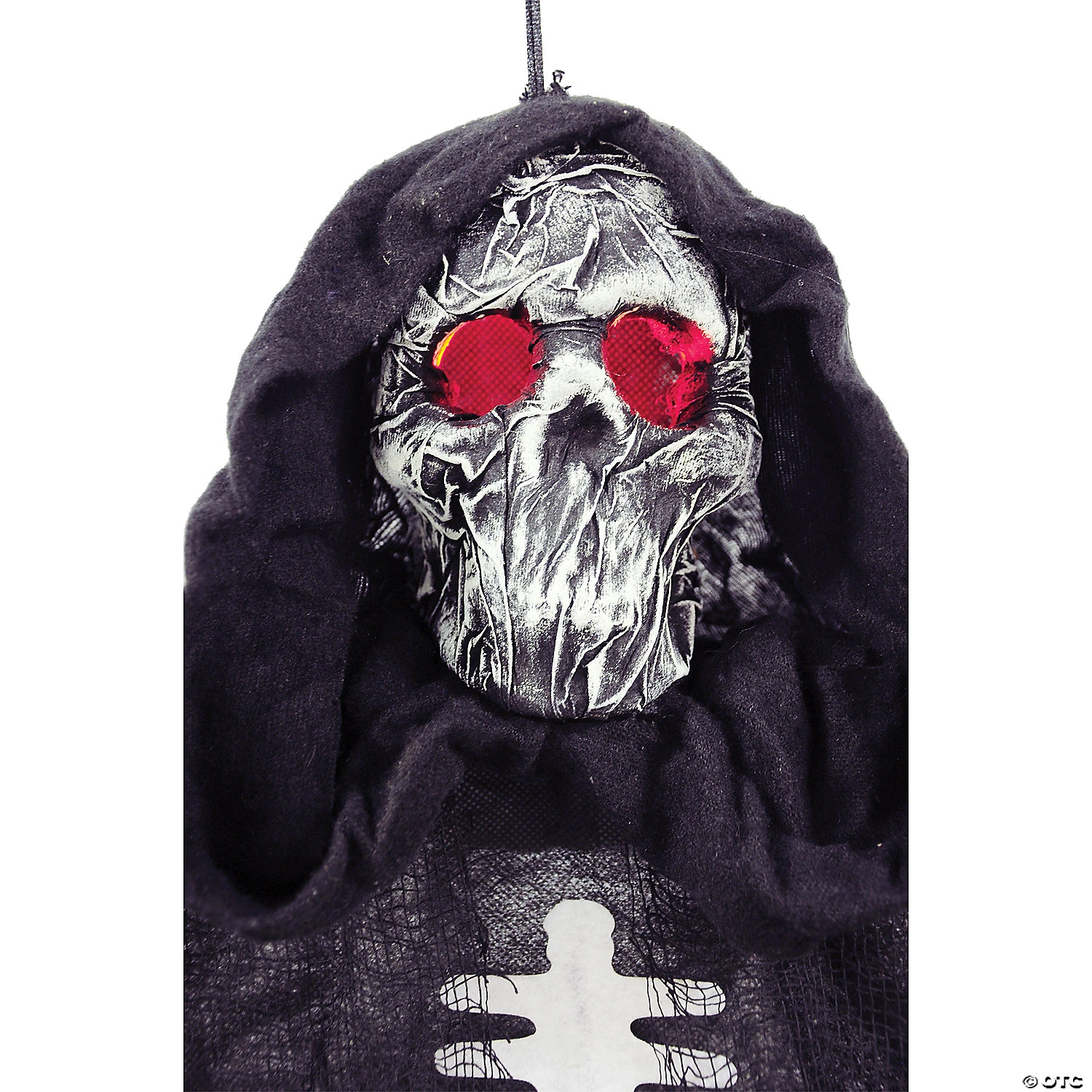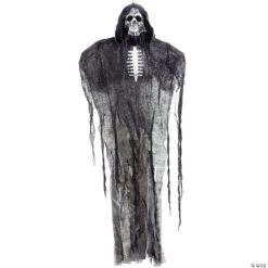 Black Reaper 55″ LightupGreat addition to your Halloween decor! Lightup Black Reaper Measures 55″ in length. Gause overlay tattered robe with hood. Poseable arms with attached chains. Requires 3 AA batteries which are not included. Material: Skull and hands are made of plastic, Robe is polyester. Comes with attached loop to display in any home haunt.