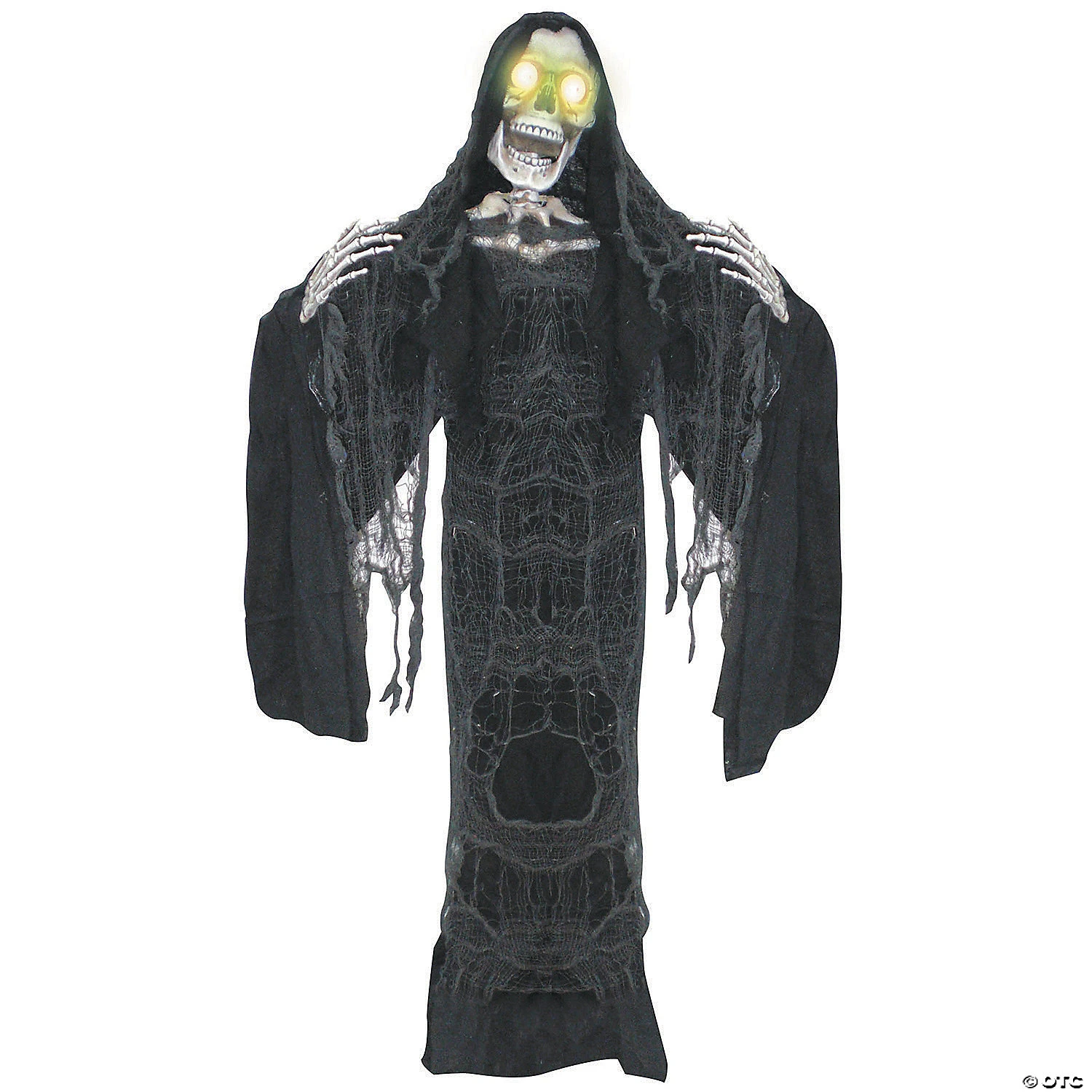 This skeleton decoration puts more horror in your Halloween décor. Ideal for your haunted house or Halloween party, his light-up eyes thrill and chill. His moving mouth utters wicked words of All Hallows Eve, and his poseable arms end in bony, fleshless hands that are simply frightful. He’s clad in a long gauzy gown that sways spookily in the breeze. Sound activated. Requires 3 AAA batteries, not included. Plastic. 60″