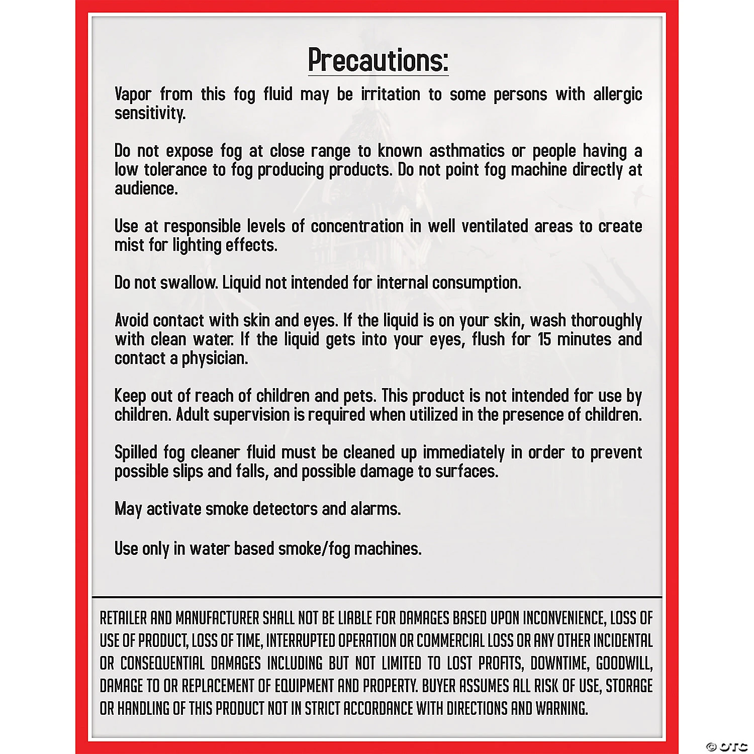 Haunted Fog Fluid Quart. Fog in a bottle! Specially designed to work for any fog machine ideal for small venues, Halloween parties, lighting effect, etc. Ready to use – Do Not Dilute. One quart (2.14 net per pound). Precautions printed on bottle for safe use. Do not swallow. Liquid not intended for internal consumption. Use only in water-based smoke/fog machines. Realistic fog for your next festive party, stage production, haunted gathering, or nay event where fog is needed! Use with fog machine to create haunting scenes.