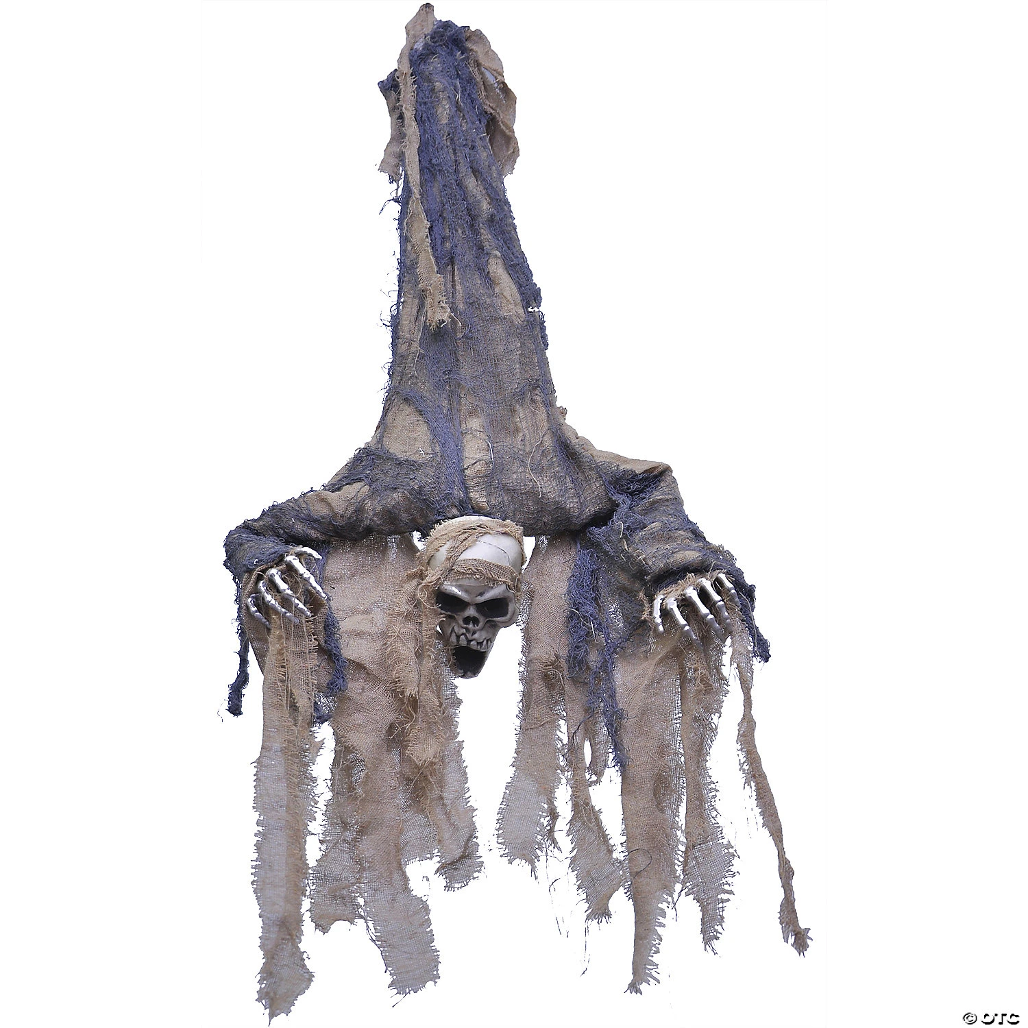 36″. This hanging ghoul is sure to cause a scare! ncludes: Hanging upside down ghoul with open mouth. Vinyl head and plastic hands. Measures 3 feet.