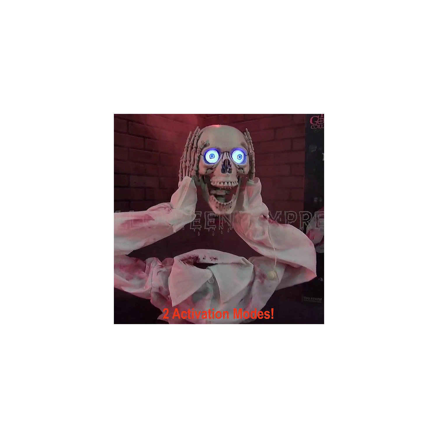 A ripping good Halloween decoration! This horrifying home accent is a perfect Halloween prop for your costume party. His piercing eyes light up to add an astonishingly creepy ambiance to your October celebration. This bony intruder looks as if he’s ripped off his head, and his shirt is spattered with spine-chilling fake blood. Requires 3 “AAA” batteries, not included. Sound activated. 2 1/4 ft.