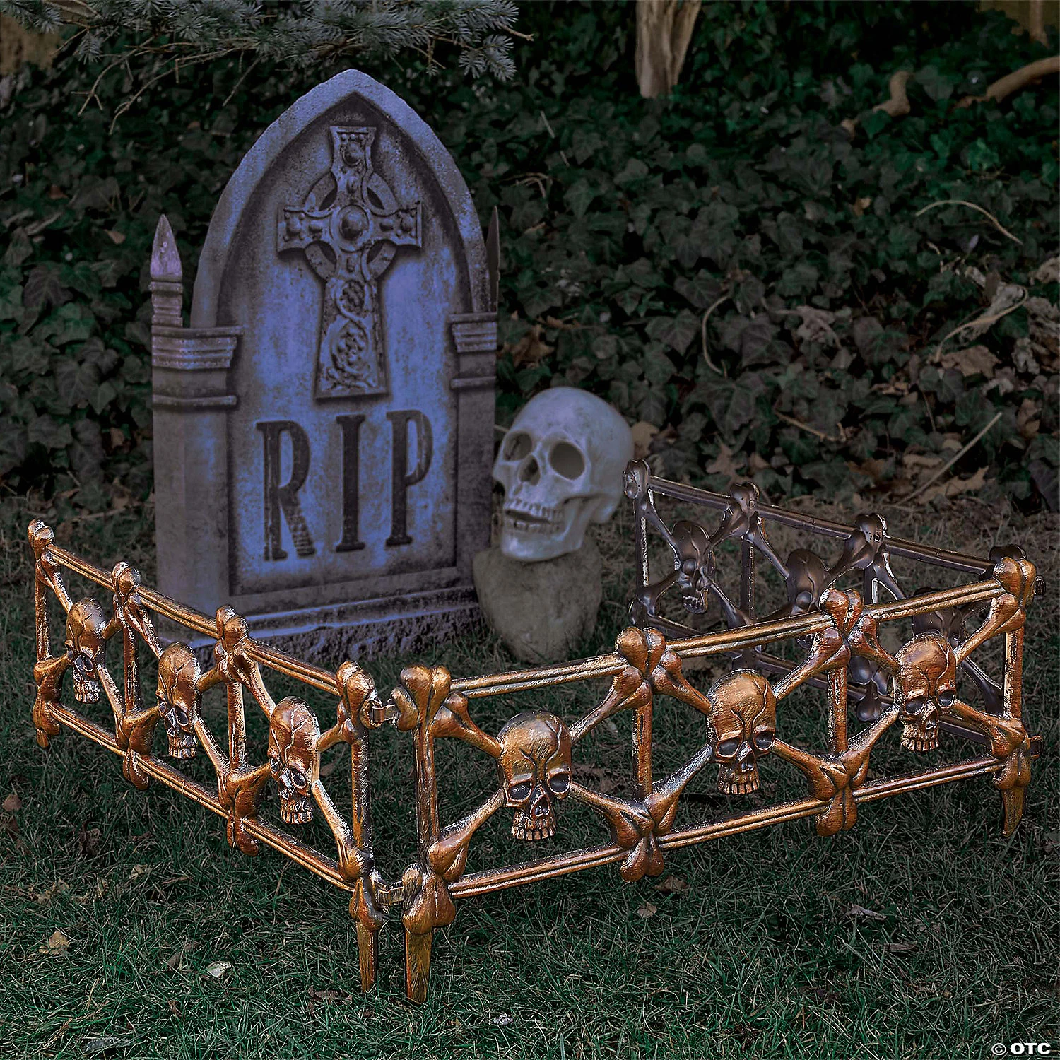 Skull and crossbones graveyard fence is a perfect border for your next haunted scene! Includes 3 fence sections with attached stakes in rust with a silver-rubbed finish. Each section is 22 inches wide x 11 inches tall. Buy several sets for larger areas. Simple set up!