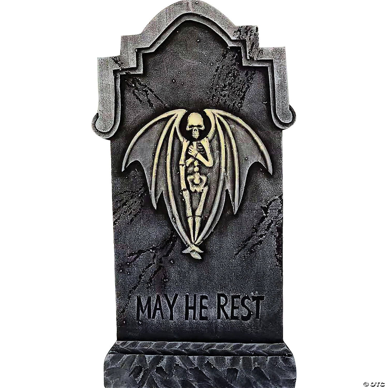 This classic Halloween Tombstone features a shackled skeleton guarded by gargoyles sitting at the base of 2 pillars. When activated the skeleton shakes violently trying to free itself while lights near the base radiate red light. The lightweight tombstone is crafted from Styrofoam and plastic to be used Indoors and in covered outdoor settings.
